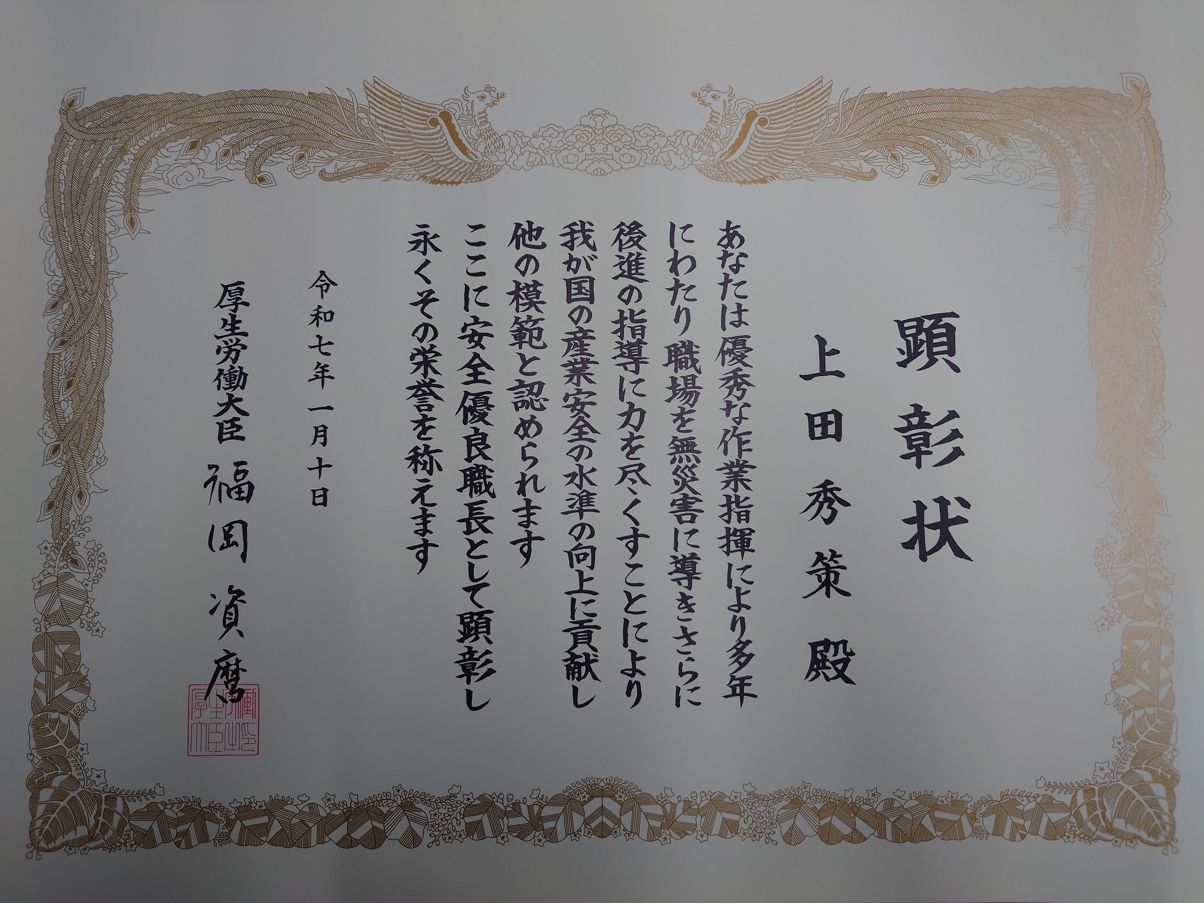 厚生労働大臣から令和6年安全優良職長厚生労働大臣顕彰を令和7年1月10日東京の砂防会館別館(シェーンバッハ・サボー)にて弊社の「上田秀策」が受賞いたしました、本人は永きに渡り鉄筋工として弊社で技術を習得し様々な現場で職長として安全第一で無事故無災害に力を尽くしました。 上田:「建設業界の皆様に支えられご指導ご鞭撻の賜です、受賞を機に今まで以上に安全第一で現場を職長として指揮していきます」